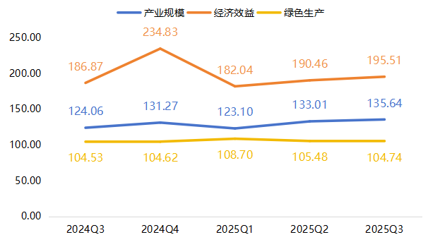 综合来看,三季度指数的良好表现主要得益于经济效益与产业规模的双重驱动。其中,经济效益指数表现尤为亮眼,达到195.51,环比增长2.65%,其持续高位运行反映出产业的市场盈利能力和资源综合利用效率保持在较高水平。同时,产业规模指数稳步回升至135.64,环比增长1.98%,表明产业的基础规模和生产活动得到了有效巩固与扩张,为整体发展提供了坚实支撑。在总体向好的态势下,绿色生产指数依旧在104.74的低位徘徊,环比微降0.70%,未能与总指数同步提升,已成为制约指数全面优化的关键短板。该指数长期在低位区间运行,提示在污染物减排、清洁生产技术和能耗控制等核心环节仍面临持续挑战,产业“绿色”内涵的深化发展任重道远。