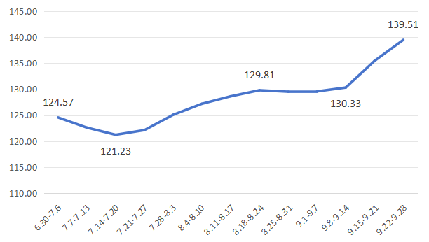 三季度,价格指数从7月初的165.56起步,经历短暂高位盘整后,自8月起转入单边下行通道,并于9月上旬触及季度低点160.70点。虽在9月中下旬受国庆节前备货需求拉动,指数企稳反弹至166点附近,但整体来看,本季度市场重心明显下移,表现偏弱。