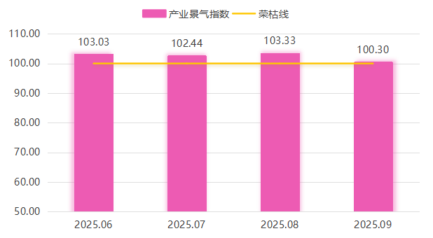 从产业内部各关键指标来看,本季度出现了显著的结构性分化(见表1)。生产端表现疲软,产品出货量和企业开工率均在9月出现明显下滑,并跌破荣枯线,反映出终端市场需求动能的减弱。与之形成鲜明对比的是,资金端状况持续优异,销售资金回款指数在整个季度均维持在极高水位,带动资金周转速度保持高效,这表明企业的现金流非常健康,抗风险能力较强。库存情况整体可控,未出现严重积压。在市场预期方面,尽管新客户指标显示市场开拓仍在进行,但代表未来信心的下月出货预期、未来销售预期及行业前景指数在三季度均一致下滑,尤其是行业前景指数回落幅度较大,凸显出市场参与者对中长期趋势的乐观情绪有所收敛,生产活动放缓。