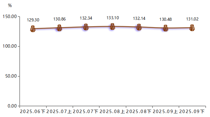 2025年三季度,大衣价格指数呈现“冲高回落,季度收涨”的运行态势。指数从6月下半月的129.30点起步,先连续上涨,于8月上半月触及季度峰值,随后波动回调,9月下半月,指数收报于131.02点,较6月下半月上涨1.33%,整体表现上行。具体运行情况如下图所示: