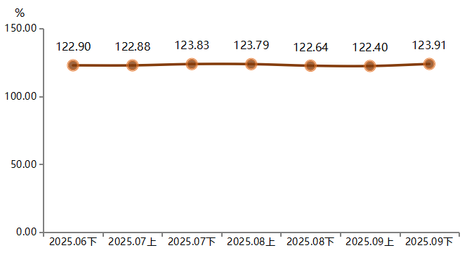 2025年三季度,熟皮价格指数在波动探底后,于9月下半月止跌上涨。9月下半月,指数收报于123.91点,较6月下半月上涨0.82%,市场在需求回暖带动下韧性回升。具体运行情况如下图所示: