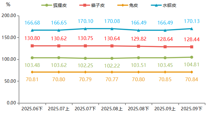 2025年三季度,熟皮市场呈结构性分化特征。水貂皮价格指数在相对高位波动上行,9月下半月指数收报于170.13点,三季度涨幅为2.07%,究其原因,市场设计新品,促使下游对高档水貂皮的采购量有所增加;9月下半月,狐狸皮价格指数为104.81点,三季度上涨1.29%,涨幅仅次于水貂皮,主要受供应减少和样本设计采购需求释放共同影响;兔皮价格指数收报于70.84点,三季度上涨0.04%,反映其供需关系保持相对稳定;貉子皮价格指数收于128.44点,三季度下跌1.80%,主要受库存积压与下游需求疲软双重影响。