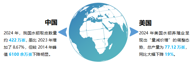 国际方面,水貂产业链上游同样呈收缩状态。据美国农业部(USDA)2025年7月发布的报告显示,2025年种貂数量下降7%,预示着行业正通过主动缩减规模应对市场压力,并转向追求单位产品的更高价值,而非规模效应,同时以黑色为主导的稳定颜色需求结构也支撑着这一“少而精”的战略转型。2024年美国水貂养殖业呈现出“量减价增”的调整态势,总产量为77.12万张,同比大幅下降19%,然而,市场供给的收缩反而推高了稀缺性,使得每张毛皮的平均价格逆势上涨6.7%至36.40美元。