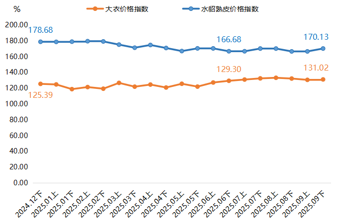 2025年三季度,大衣价格指数呈现冲高回落态势。7月上半月至8月上半月,原材料成本上升、企业设计样品及高端产品提价等因素叠加,共同推动大衣价格指数上涨;8月下半月至9月下半月,成本支撑减弱、采购需求阶段性放缓及市场自发调节,促使大衣价格指数回落,截至9月下半月,大衣价格指数收报131.02点,较6月下半月上涨1.33%。
