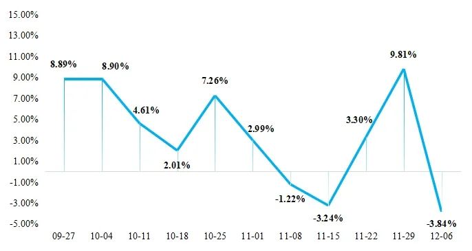 同比来看,水果价格低于上年同期水平(2023年12月02日-12月08日),同比跌幅为3.84%。