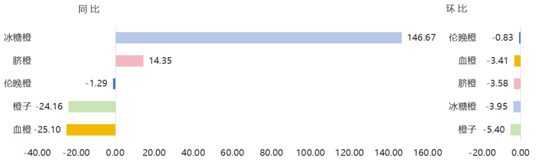 品种分析:同比来看,湖南冰糖橙供给偏紧,价格仍居于高位,同比价格指数上涨146.67%;脐橙同比价格指数上涨14.35%;血橙、橙子、伦晚橙同比价格指数分别下跌25.10%、24.16%、1.29%。环比来看,随着各产区果品集中上市,市场供给宽松,橙子类价格均表现下行,但各果品环比价格指数跌幅均在10%以下。