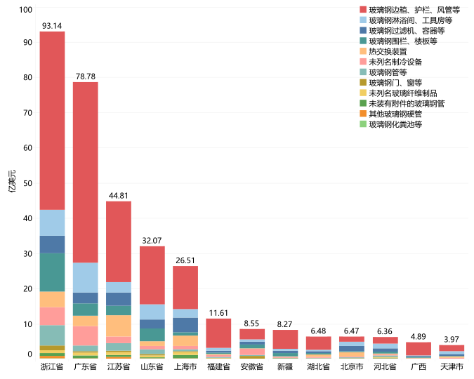 【注:出口额前三的玻璃钢制品对应海关编码分别为39269090(未列名塑料制品)、94069000(其他材料制活动房屋)、84219990(品目8421未列名机器的零件)】