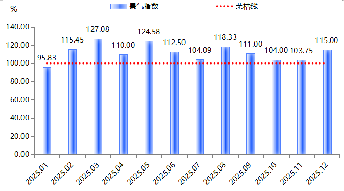 2025年,产业景气指数除1月收报于不景气区间外,其余月份,指数始终在荣枯线上方的景气区间波动运行。截至12月,产业景气指数为115.00点,产业景气运行。具体运行情况如下: