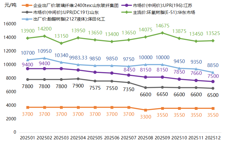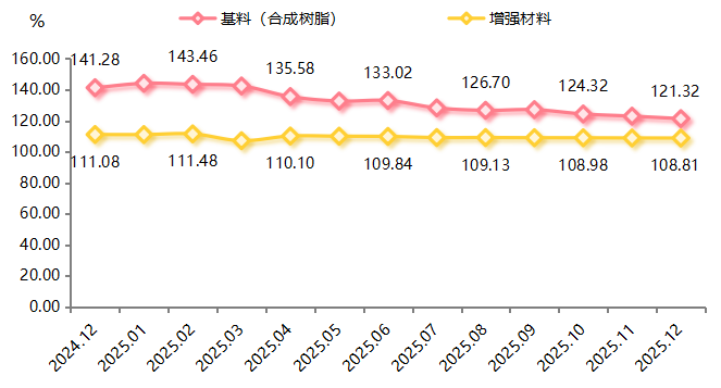 复合材料原料主要包含基料和增强材料两个大类。2025年,基料、增强材料价格指数均有不同程度下行。其中,基料(合成树脂)价格指数走势与总指数一致,下行幅度显著;增强材料价格则运行平稳,显示出较强的抗跌韧性。全年来看,原料市场整体处于去库存、调结构的阶段,成本压力逐步缓解,为下游企业盈利改善提供了有利条件。具体运行情况如下: