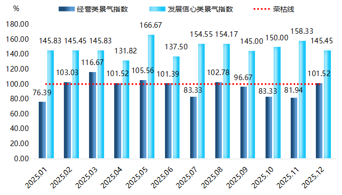 2025年,经营类景气指数受原材料价格波动、市场需求阶段性减弱及环保政策收紧等因素影响,在76.39点至116.67点之间宽幅震荡,尤其在传统淡季,如1月和11至12月,成本压力集中释放期,如7月,经营类景气指数一度承压回落;而发展信心类景气指数则始终维持在130点以上的高位景气区间,全年景气运行,12月指数收报于145.45点,凸显企业对复合材料在新能源、高端装备等战略领域长期需求的坚定看好。
