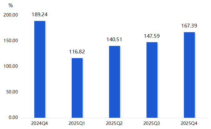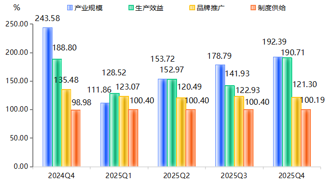 2025年四季度,产业规模指数报收于192.39点,同比下降21.02%,但环比增长7.61%。表明产业整体仍处于规模调整与去库存阶段。短期看,规模扩张态势有所回暖,释放出企稳修复的积极信号。