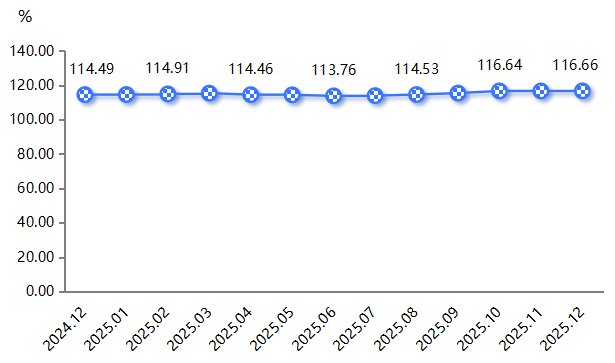 2025年,在原料成本下降背景下,产品价格指数仍实现温和上涨,体现产品附加值有所提升。12月,产品价格指数为116.66点,同比上涨1.89%,具体运行情况如下: