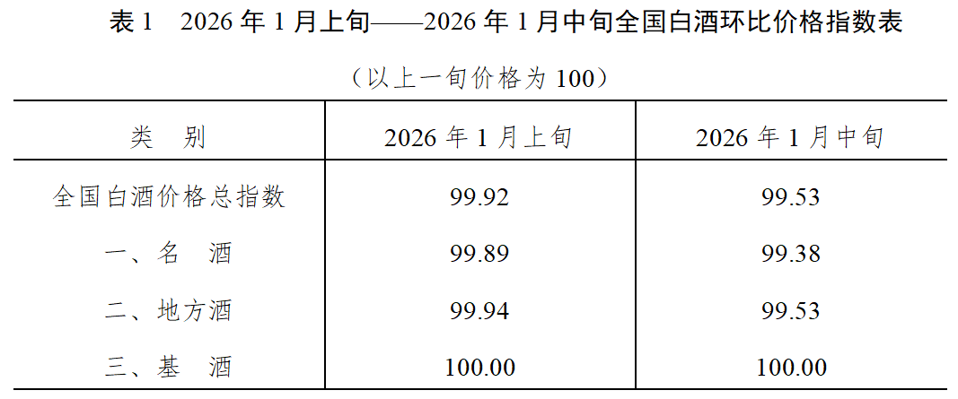 泸州·中国白酒商品批发价格指数办公室发布的数据显示,2026年1月中旬全国白酒环比价格总指数为99.53,下跌0.47%。从分类指数看,名酒环比价格指数为99.38,下跌0.62%;地方酒环比价格指数为99.53,下跌0.47%;基酒环比价格指数为100.00,保持稳定。(见表1)