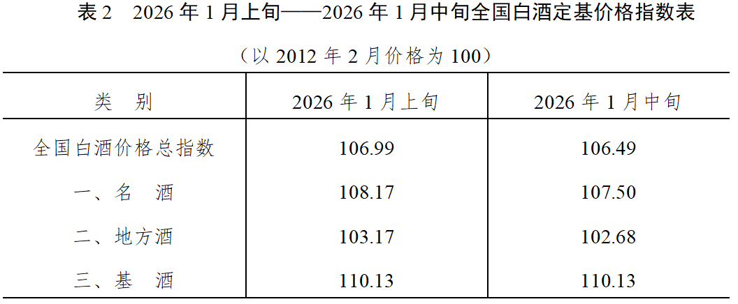 从定基指数看,2026年1月中旬全国白酒商品批发价格定基总指数为106.49,上涨6.49%。其中,名酒定基价格指数为107.50,上涨7.50%;地方酒定基价格指数为102.68,上涨2.68%;基酒定基价格指数为110.13,上涨10.13%。(见表2)
