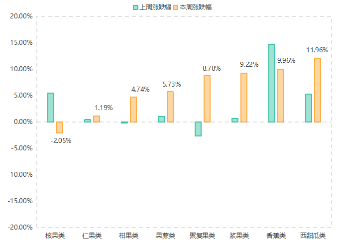 具体品类来看,本期除核果类(-2.05%)水果价格指数由升转降外,其余七类水果价格指数均呈现上升态势。其中柑果类(4.74%)、聚复果类(8.78%)水果价格指数本期止降为升;仁果类(1.19%)、果蔗类(5.73%)、浆果类(9.22%)、西甜瓜类(11.96%)水果价格指数本期升幅均有所扩大;香蕉类水果价格指数本期升幅则收窄至9.96%。