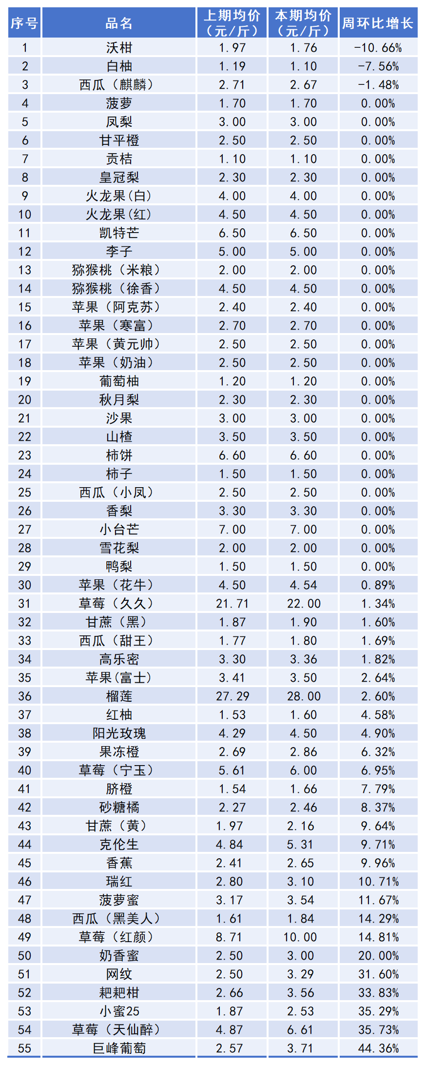 从具体水果品种来看,本期价格上涨的有26种,占总水果品种的47.27%,其中巨峰葡萄本期均价3.71元/斤,上期均价2.57元/斤,环比涨幅达44.36%;价格下跌的有3种,占总水果品种的5.50%,其中沃柑本期均价1.76元/斤,上期均价1.97元/斤,环比下降10.66%;本期价格持平的水果有26种。