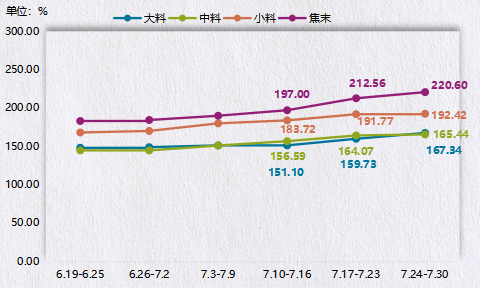 兰炭各细分产品价格指数均呈上涨走势。具体来看,大中小料、焦末价格指数分别收报于167.34点、165.44点、192.42点、220.60点,环比分别上涨4.76%、0.84%、0.34%、3.78%。分析来看,大料本期上涨幅度最高,企业定价较上周均有所上涨;焦末则在电厂需求带动下继续上探;中料下游电石市场持稳运行,企业出货顺畅,随着下游PVC需求持续走高,市场观望情绪渐浓,对于兰炭的中料补库较为积极;小料下游硅铁市场呈现弱稳运行,随着钢铁招标时间临近,下游钢厂对于硅铁将有拉动作用。