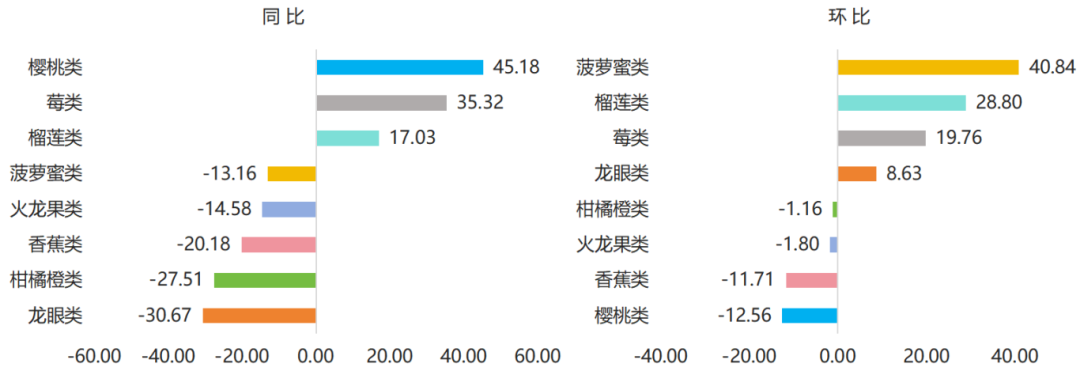 环比来看,进口水果细分果品价格表现上涨的果品中,菠萝蜜类生产已经进入淡季,市场上的优质菠萝蜜供应不多,价格涨势最为明显,环比价格指数上涨40.84%;榴莲类、莓类环比价格指数分别上涨28.80%、19.76%;龙眼类环比价格指数涨幅相对较小,为8.63%。樱桃类、香蕉类环比价格指数表现下跌,跌幅分别为12.56%、11.71%;火龙果类、柑橘橙类价格小幅下行,环比价格指数跌幅分别为1.80%、1.16%。