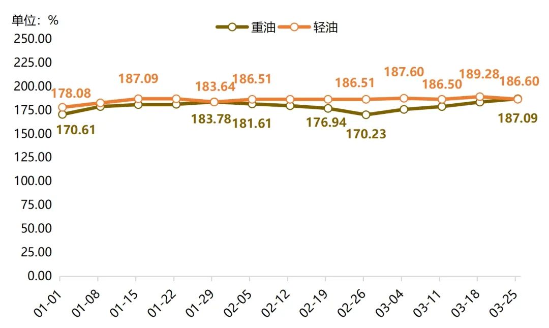 具体来看,重油价格指数涨幅相对较大,指数由1月第一周的170.61点涨至3月最后一周的187.09点,一季度累计涨幅为13.75%;轻油价格指数涨幅相对较小,指数由1月第一周的178.08点涨至3月最后一周的186.60点,一季度累计涨幅为3.31%。分析来看,重油主要作为各种锅炉和工业用炉的燃料油,市场需求偏多,价格波动相对较大;轻油多用于提炼煤气、制氨原料,需求偏小,价格相对稳定。