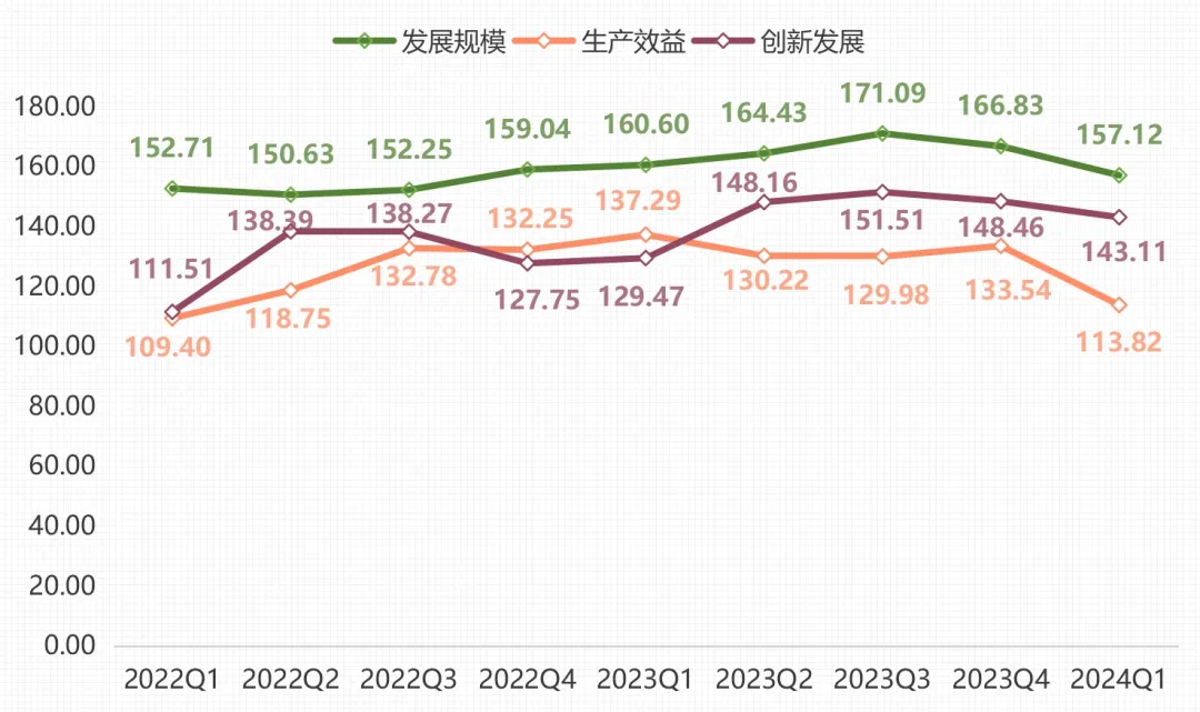 产业发展指数下设产业规模、生产效益和创新发展三大细分指数,一季度三大细分指数同步下行。