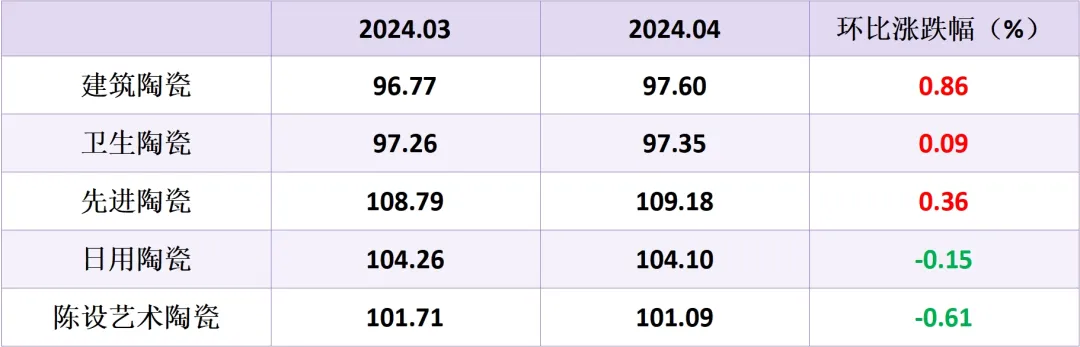 根据陶瓷的功能设计不同,中国陶瓷价格指数由日用陶瓷、陈设艺术陶瓷、建筑陶瓷、卫生陶瓷和先进陶瓷等五类细分价格指数构成。2024年4月,五类分项陶瓷价格指数表现为“三涨两跌”。其中,建筑陶瓷、卫生陶瓷和先进陶瓷价格指数分别收于97.60点、97.35点和109.18点,环比均有不同程度的上涨;日用陶瓷和陈设艺术陶瓷价格指数双双下跌,本期指数分别收于104.10点和101.09点。