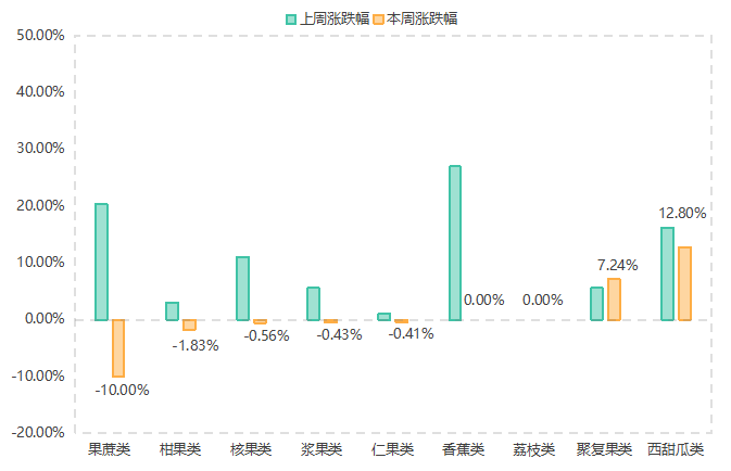 九大类水果中,果蔗类(-10.00%)、柑果类(-1.83%)、核果类(-0.56%)、浆果类(-0.43%)、仁果类(-0.41%)水果价格指数本期均由升转降;聚复果类(7.24%)水果价格指数本期升幅略有上升;西甜瓜类(12.80%)水果价格指数本期升幅则有所收窄。