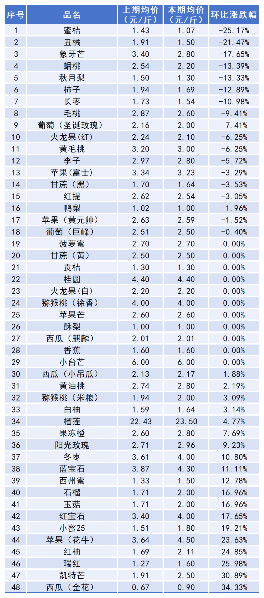 从具体水果品种来看,本期价格上涨的水果有19种,占总水果品种的39.58%,其中金花西瓜本期均价0.90元/斤,上期均价0.67元/斤,环比涨幅达34.33%;价格下跌的水果有18种,占总水果品种的37.50%,其中蜜桔本期均价1.07元/斤,上期均价1.43元/斤,环比下降25.17%;本期价格持平的水果有11种。