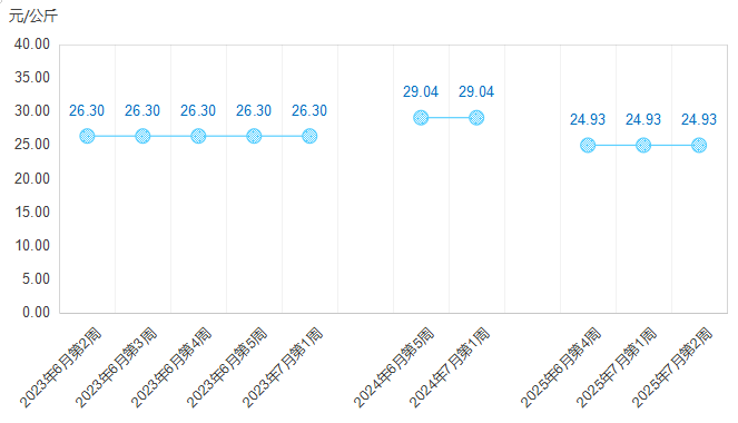 阳光玫瑰是近年来兴起的高端鲜食葡萄品种,以其浓郁的玫瑰香气和极甜的口感著称,浦江地区一般8月开始成熟上市。8月第1周,阳光玫瑰开始少量上市,市场零售均价约为29.86元/公斤,8月第2周开始,随着阳光玫瑰进入集中上市期,其零售价逐步降低至8月第4周的24.68元/公斤,9月第1周保持稳定。9月第2周,阳光玫瑰价格出现显著反弹,上涨至36.55元/公斤,环比涨幅高达48.10%,受国庆、中秋礼品市场需求拉动,礼品盒和优质精品果价格较高,推动阳光玫瑰均价上涨。较往年来看,今年阳光玫瑰价格较2023年的42.15元/公斤仍有一定差距,但较2024年同期有明显提升。