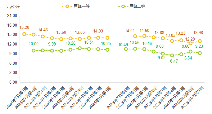 9月,巨峰葡萄价格温和上涨。9月,浦江巨峰葡萄库存量较去年同期整体偏低,农户惜售情绪增强,尤其对优质果品持观望态度,由此部分农户放缓出货节奏,等待国庆、中秋双节销售高峰到来。9月第1周,巨峰一等、二等价格均出现回升,分别上涨至13.23元/公斤、8.84元/公斤;9月第2周,巨峰一等价格小幅回落至12.28元/公斤,巨峰二等价格则继续上涨至9.68元/公斤;9月第3周,巨峰一等回升至12.98元/公斤,巨峰二等则回落至9.23元/公斤。