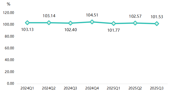 2025年三季度,高阳纺织产业竞争力指数收于101.53点,环比下降1.02%,同比下降0.85%,产业竞争力呈小幅调整态势。