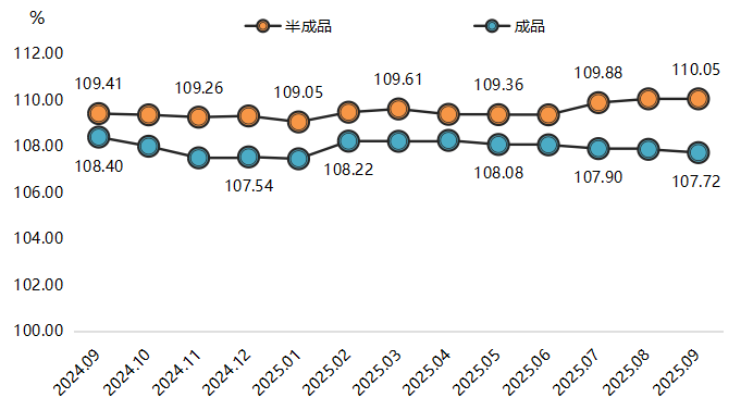 半成品价格指数预计稳步上升。一方面,随着国内外纺织原料市场供需结构的持续优化改善,特别是棉花等大宗原料供应趋于稳定,棉纱等主要原材料价格已经进入企稳阶段;另一方面,考虑到四季度是纺织行业传统的生产旺季,企业备货需求集中释放,叠加年底赶工效应,半成品价格指数有望延续上行走势。