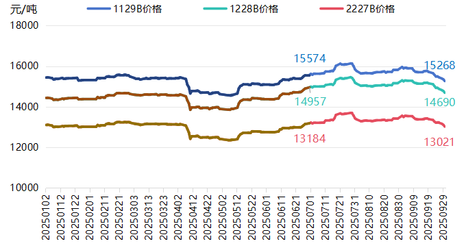国内棉花价格整体承压,呈现“供需双弱、预期转淡”的特征。前期因下游需求疲软及季节性因素,棉价走势低迷。尽管九月传统旺季来临,但订单支撑不足导致“金九”成色欠缺。当前陈棉库存偏低为现货提供一定抗跌性,然而新棉丰产预期强烈、开秤价偏低,加之轧花厂套保压力与下游“随用随买”的谨慎心态,共同制约了价格反弹空间,预计短期内棉价将维持震荡偏弱格局。2025年三季度,国内棉花价格有所下行,9月30日,中国棉花价格指数1129B的价格为15268元/吨,较7月1日的15625元/吨下跌了2.28%。