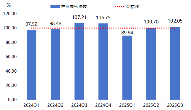 产业规模指数稳中有进。三季度指数收报于142.94点,环比下降1.12%,同比增长1.33%,表明产业基础规模依然稳固,但短期面临调整压力。从细分指标看,规上企业数指数保持稳定,企业总产值指数同比增长3.47%,产业基本面依然稳健。而从业人员数指数环比下降1.99%,同比下降3.20%,在自动化水平提升和产业转型背景下,就业规模有所收缩。