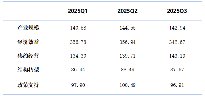 集约经营指数表现突出。本期指数收于143.19点,环比上升2.50%,同比上升8.40%,成为本季度最大亮点。具体来看,亩均产值指数同比提升23.89%,人均管理机器数指数同比上升18.83%,显示企业在自动化改造和精细化管理方面取得显著成效。不过,单位电耗产值指数同比下降5.08%,反映出能源利用效率仍有提升空间。