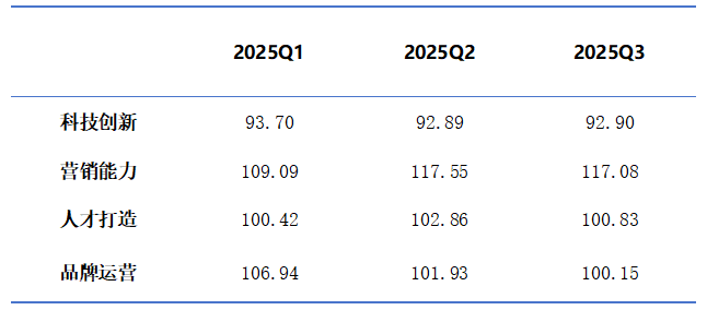 营销能力指数表现相对突出。本期指数为117.08点,虽环比下降0.40%,但同比上升10.50%,且相对水平位置最高,是本季度竞争力指数中的亮点,表明企业在市场开拓、销售渠道建设方面取得显著成效,营销竞争力持续增强。科技创新指数有所提升。三季度指数收报于92.90点,环比上升0.02%,同比下降7.13%,短期看,研发经费投入增加拉动科技创新指数提升。人才打造指数小幅调整。三季度指数收于100.83点,环比下降1.98%,同比上升1.03%。品牌运营指数有所回落。三季度指数收于100.15点,环比下降1.75%,同比下降4.62%。品牌建设效果不及预期,品牌价值和市场影响力有待进一步提升。