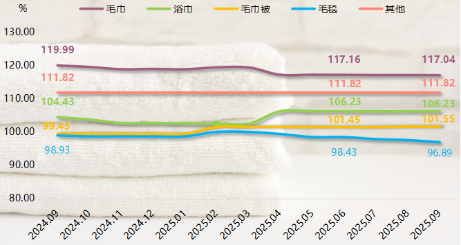 根据产品用途不同,将纺织成品进一步细分为毛巾、浴巾、毛巾被、毛毯和其他纺织成品,2025年三季度各细分产品价格指数走势如下: