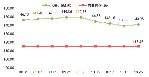 从分类指数看,天麻价格指数是带动总指数回升的核心动力,本期收报140.95点,环比上涨1.21%。两菌价格指数则继续保持稳定,收报115.46点。