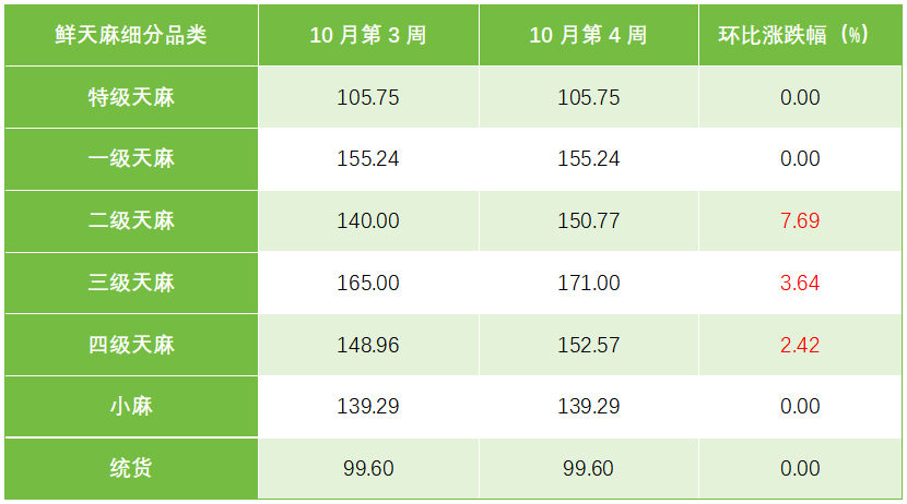 鲜天麻价格指数收报139.17点,环比上涨2.25%,主要是中端个头的天麻领涨市场,其中二级天麻价格指数涨幅最为显著,环比上涨7.69%;三级、四级天麻价格指数分别环比上涨3.64%、2.42%。指数增长表明,随着传统滋补旺季临近,对品质有一定要求的中成药企和高端消费市场备货需求开始启动。而特级、一级、小麻及统货天麻价格保持平稳,显示出市场需求的复苏尚不均衡,整体仍处于逐步恢复阶段。