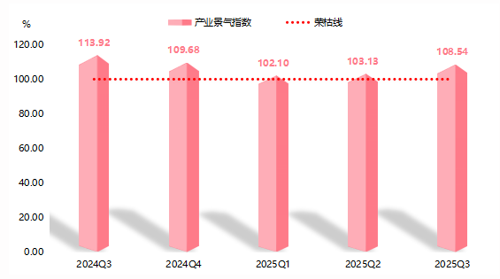 2025年三季度,沧县红枣及干果坚果食品产业景气指数表现良好,指数收于108.54点,高出荣枯线8.54个百分点,表明行业整体发展情况良好,市场信心较为充足。具体运行情况如下图所示: