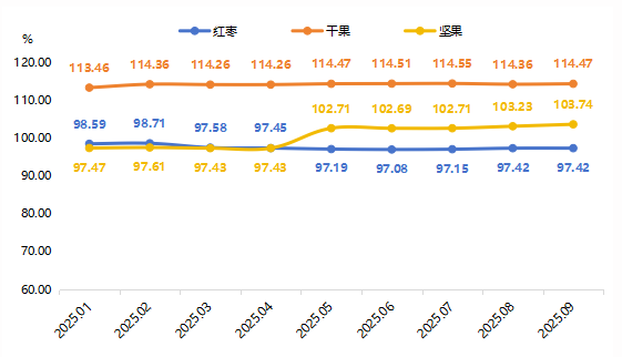 红枣及干果坚果产品价格指数下设红枣、干果、坚果三类产品价格指数,2025年三季度三类产品价格指数走势如下图所示: