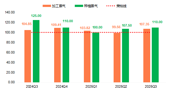 产业景气指数下设加工景气指数和种植景气指数。2025年三季度两类景气指数运行情况如下图所示: