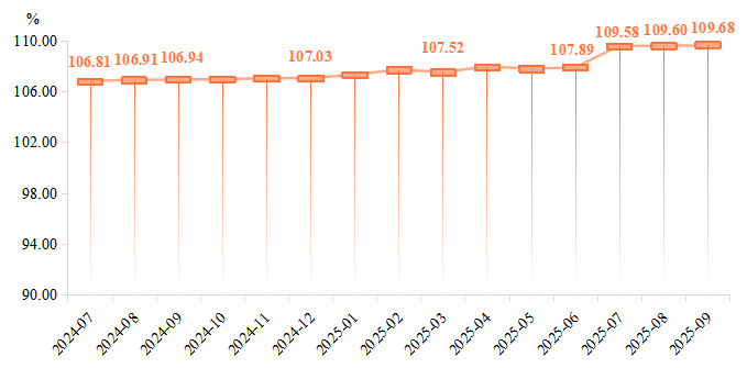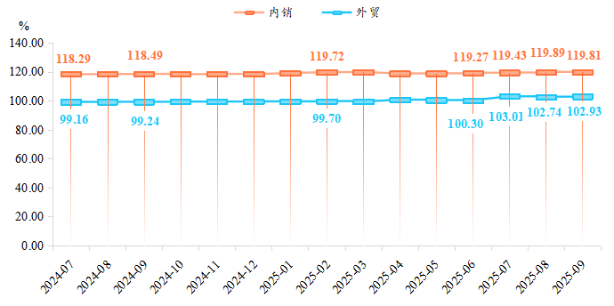 7月,原材料价格普遍下行,企业成本压力得到缓解,叠加内外需市场的同步发力,推动模具价格指数显著上行,收于109.58点,环比上涨1.57%。8月,成本端对产品价格存在一定支撑,需求端呈现多元化特征,整体行情保持向好,模具价格指数收于109.60点,环比上涨但涨幅有所放缓。9月,模具价格指数延续涨势,收于109.68点,同比和环比分别上涨2.56%和0.07%。