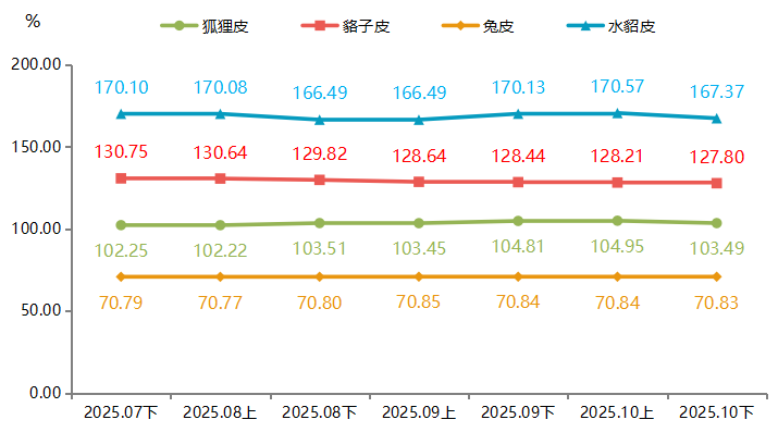 10月,细分熟皮价格指数普遍承压运行。截至10月下半月,狐狸皮价格指数为103.49点,较9月下半月下降1.26%,究其原因,下游市场为提升经营灵活性,减少库存储备,短期需求支撑有所减弱;貉子皮价格指数为127.80点,较9月下半月微降0.50%,整体走势相对平稳,长期需求基础稳固;兔皮价格指数收报于70.83点,仍处于相对低位区间;水貂皮价格指数先涨后跌,10月下半月指数为167.37点,较9月下半月下降1.62%,反映出高端裘皮市场需求尚未有效释放,供应端面临压力。