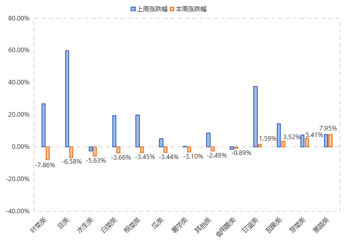 价格指数下降品类中:叶菜类(-7.86%)、豆类(-6.58%)、白菜类(-3.66%)、根菜类(-3.45%)、瓜类(-3.44%)、薯芋类(-3.10%)和其他类(-2.49%)蔬菜价格指数本期均由升转降;水生类(-5.63%)蔬菜价格指数本期降幅有所扩大;食用菌类(-0.89%)蔬菜价格指数本期降幅略有缩小。