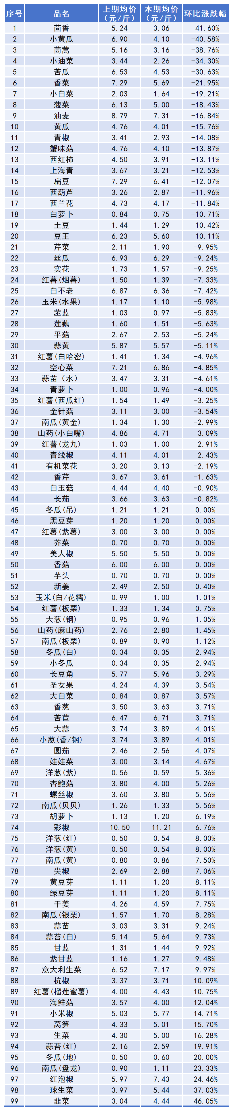 从具体蔬菜品种来看,本期价格上涨的蔬菜有48种,占总蔬菜品种48.48%,其中韭菜本期均价4.44元/斤,上期均价3.04元/斤,环比涨幅达46.05%;价格下跌的蔬菜有44种,占总蔬菜品种44.44%,其中茴香本期均价3.06元/斤,上期均价5.24元/斤,环比下降41.60%;本期价格持平的蔬菜有7种。
