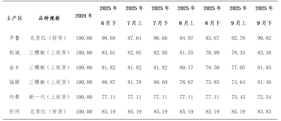 2025年第三季度,全国干辣椒价格指数整体呈下行趋势,9月下半月指数为86.45点,较6月下半月下降3.63%。为监测并对比开鲁与全国其他干辣椒产区的价格波动情况并分析其背后成因,选取柘城、金乡、临颍、内黄、忻州五大主产区,以2024年各月均值为基准值,基期为100点,编制各产区干椒价格指数。具体运行情况见下表: