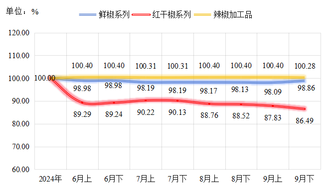 产品价格指数根据辣椒产品形态不同又分为鲜椒、红干椒和辣椒加工品三大类。2025年三季度,三类辣椒价格指数整体均呈现小幅下跌趋势,具体运行情况见下图: