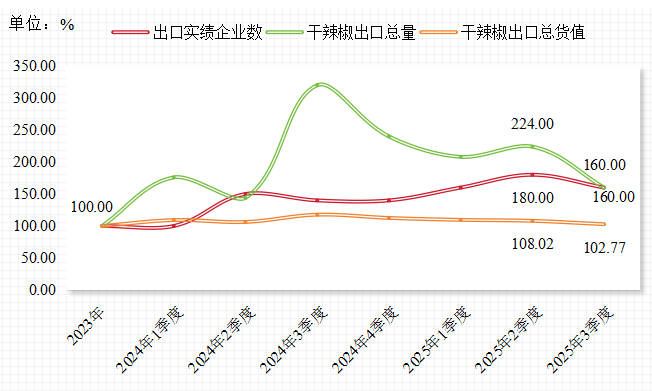 2025年三季度,开鲁辣椒出口贸易指数在经历上半年高位运行后出现阶段性回调,整体呈现“量减价稳”的运行特征。本期出口贸易指数下设出口实绩企业数、干辣椒出口总量与出口总货值三项细分指标分别为160.00点、160.00点和102.77点,环比分别下降11.11%、28.57%和4.86%,反映出在季节性供应空窗与国际市场竞争加剧的双重压力下,出口规模有所收缩,但价格仍具一定韧性。值得注意的是,本季度开鲁辣椒出口面临着更为复杂的国际市场环境,一方面全球辣椒出口竞争日趋激烈,另一方面美国关税政策持续加码导致中国农产品出口成本普遍增加。面对不利局面,开鲁县通过创新推行“1+N”出口辣椒种植基地备案监管新模式,将全县32万亩辣椒种植基地整合为一个“大基地”统一管理,并实施“五统一”标准化管理模式,在不利的国际环境中依然保持了出口价格的相对稳定。此外,开鲁县上半年与韩国客商签订的1.4万吨冷冻辣椒出口订单在本季度陆续执行,也为价格韧性提供了一定支撑。