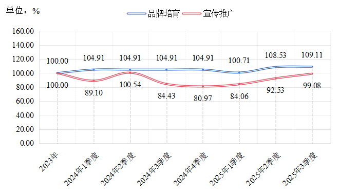 2025年三季度,品牌培育指数和宣传推广指数分别达到109.11点和99.08点,环比分别增长0.54%和7.07%,呈现出“基础建设稳步推进,宣传推广快速提升”的良性发展态势。