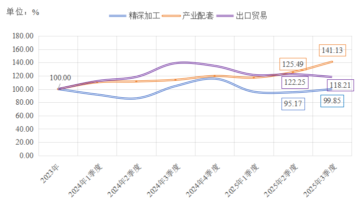 2025年三季度,综合发展指数下设精深加工、产业配套和出口贸易指数呈“两升一降”运行态势。具体运行情况见下图: